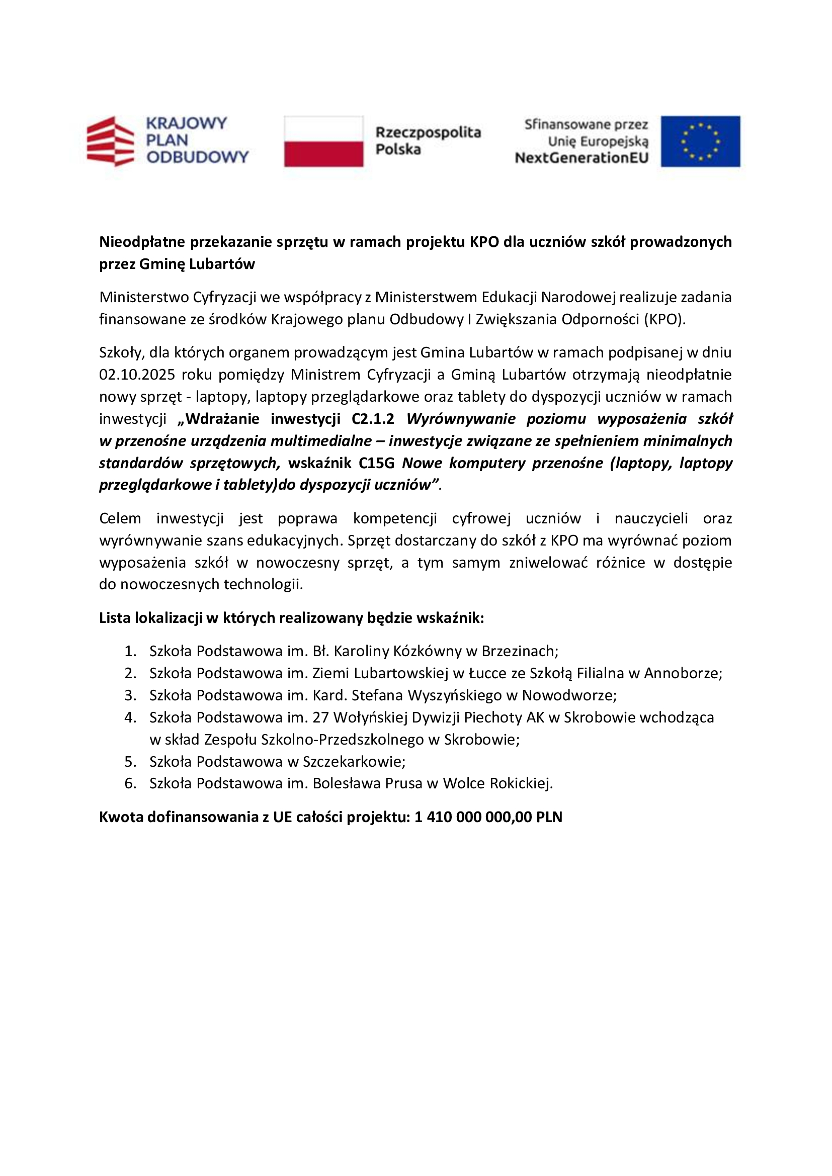 Szkoły, dla których organem prowadzącym jest Gmina Lubartów w ramach podpisanej w dniu 02.10.2025 roku pomiędzy Ministrem Cyfryzacji a Gminą Lubartów otrzymają nieodpłatnie nowy sprzęt - laptopy, laptopy przeglądarkowe oraz tablety do dyspozycji uczniów w ramach inwestycji „Wdrażanie inwestycji C2.1.2 Wyrównywanie poziomu wyposażenia szkół w przenośne urządzenia multimedialne – inwestycje związane ze spełnieniem minimalnych standardów sprzętowych, wskaźnik C15G Nowe komputery przenośne (laptopy, laptopy przeglądarkowe i tablety)do dyspozycji uczniów” .