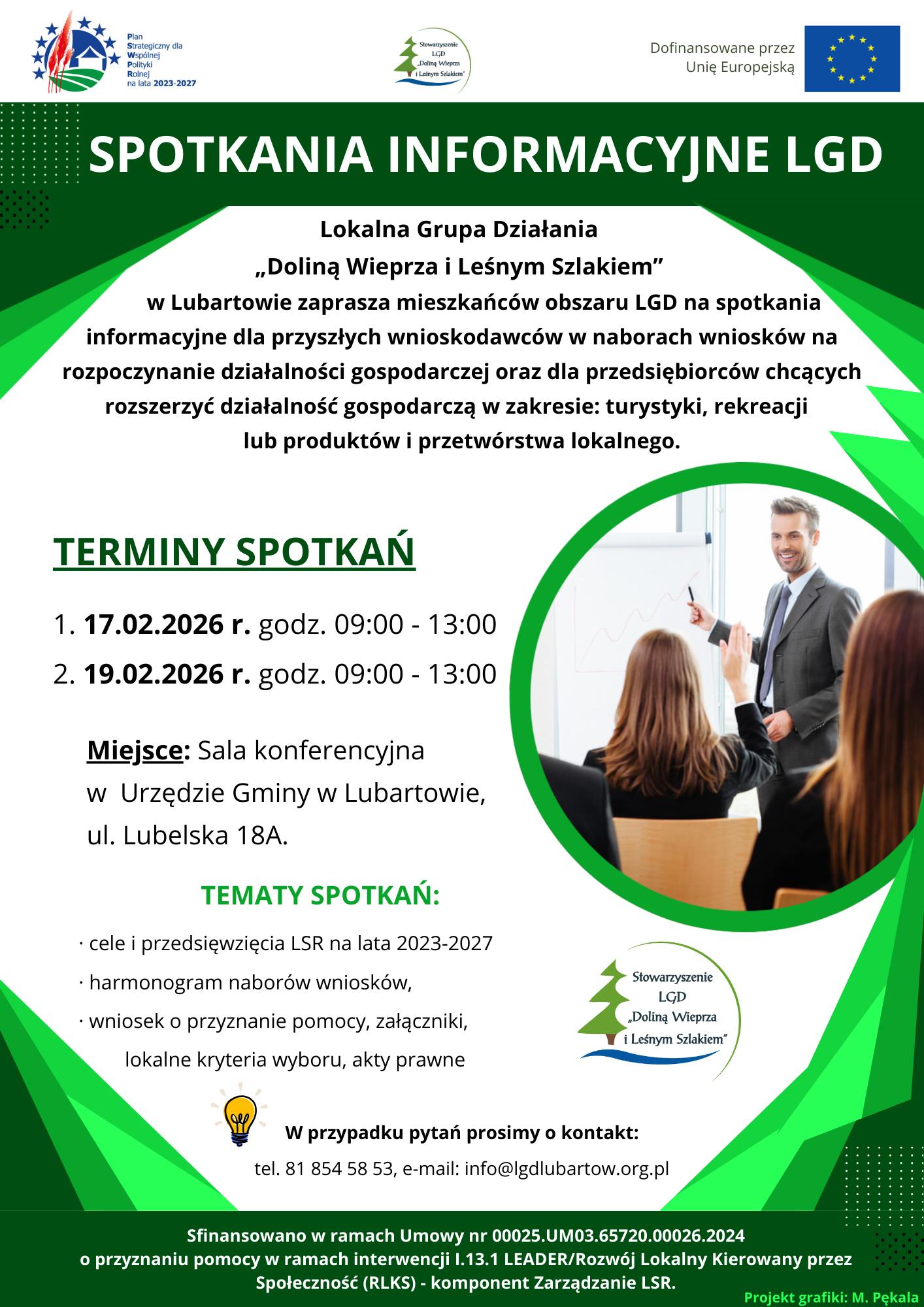 Miejsce: Urząd Gminy w Lubartowie, ul. Lubelska 18A Podczas spotkań omówimy m.in. cele LSR 2023–2027, harmonogram naborów, zasady składania wniosków i lokalne kryteria wyboru.